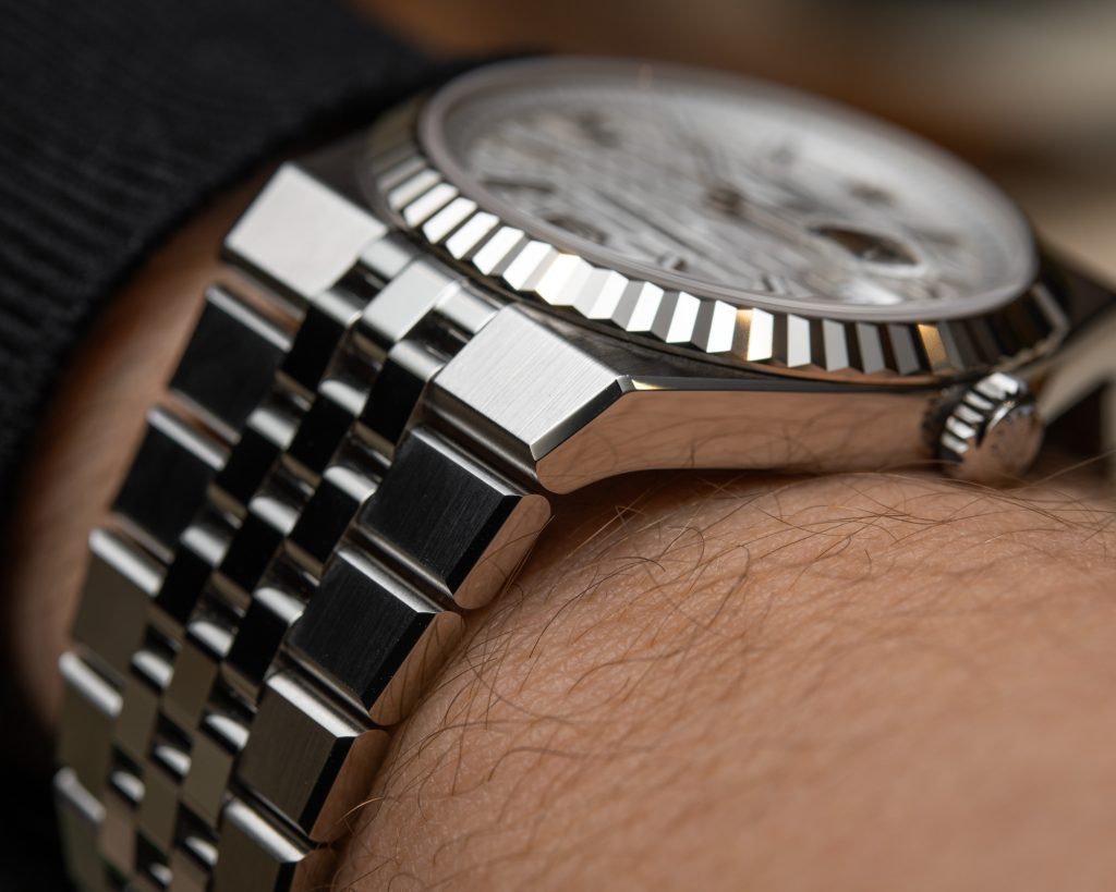 The White Rolesor finish gives the Land-Dweller a sleek and contemporary look. The polished stainless steel bracelet complements the subtle white gold bezel, creating a versatile style suitable for both casual and formal occasions. Its clean dial design, luminous markers, and classic hands enhance readability, ensuring that practicality never compromises elegance.