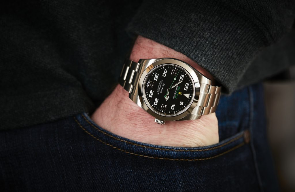 One of the most discussed aspects of the Air-King is its dial complexity. Unlike minimalist dress watches, this model embraces a cockpit instrument aesthetic, inspired by aviation dashboards. The contrast between white text, green accents, and bold numerals makes it instantly recognizable even from a distance. This unique design is also the reason it is often replicated, as it is visually striking and easy to imitate at first glance, even if details differ significantly under closer inspection.