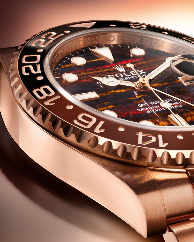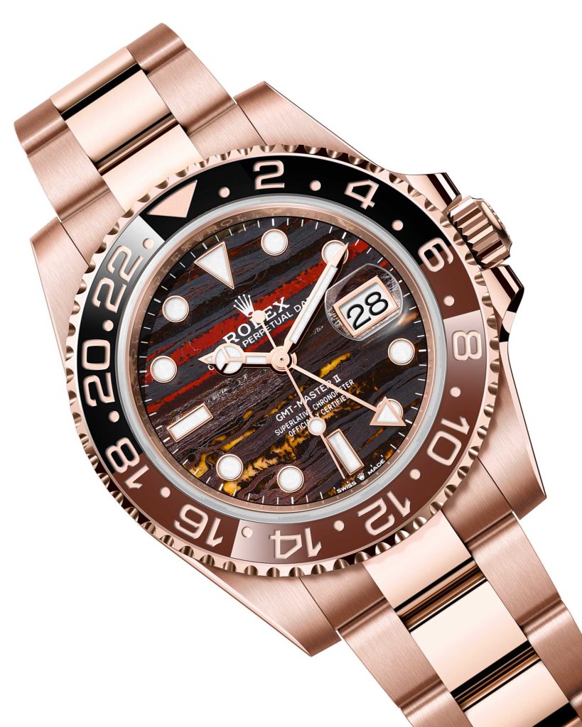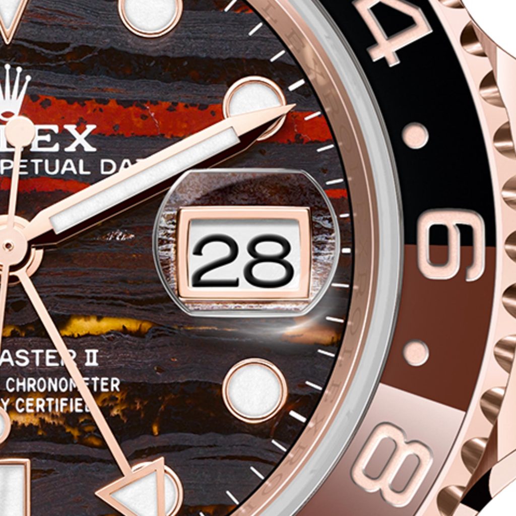 This type of dial is not commonly offered by Rolex in the standard GMT-Master II lineup, which makes it especially attractive to those who want something different from the typical black or chocolate sunburst dial. The stone’s natural texture adds depth and character, and under different lighting conditions it can shift from warm gold tones to darker, almost volcanic shades. For replica manufacturers, using a Tiger’s Iron dial is a way to make their version stand out and appeal to buyers who value individuality over strict authenticity.
